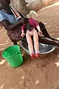 Selon les cas et les rituels, il est pratiqué par la mère, une personne proche de la mère (la grand-mère chez les Wolof[1]). Le bébé est généralement nu et allongé sur les jambes de la masseuse.