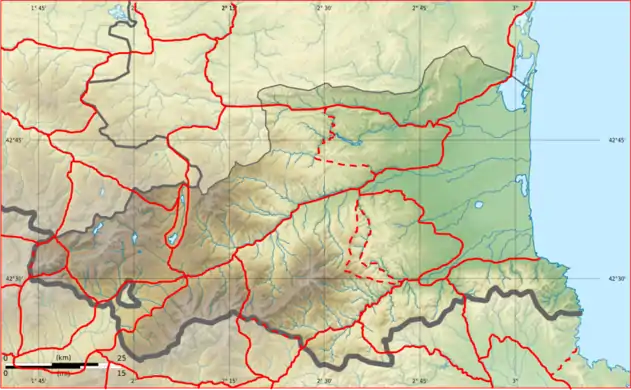 | Localisation du massif et ceux adjacents sur la carte des Pyrénées-Orientales. | ||||||||||||||||