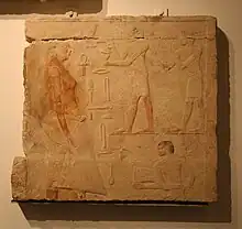 Ce bloc en relief appartenait à la plus haute des trois bandes d'images du soffite de passage droit entre deux pièces. Il représente la reliure et l'abattage d'un bœuf. Un homme tient le bœuf par les cornes tandis qu'un deuxième tire les pattes avant de dessous avec une corde et donne un coup de pied à la patte arrière avec son pied pour faire tomber l'animal. L'inscription indique qu'il s'agit d'une jeune offrande au propriétaire de la tombe.