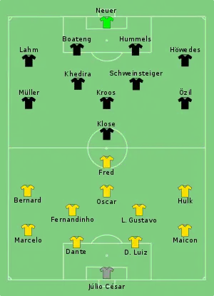 Le capitaine brésilien Thiago Silva est suspendu pour le match après une accumulation de cartons jaunes, l'appel de la confédération brésilienne demandant la levée de la suspension ayant été rejeté[7]. L'attaquant Neymar est également indisponible à la suite d'une fracture à une vertèbre contractée lors du match contre la Colombie, le rendant indisponible pour le reste du tournoi[8],[9]. Dante et Bernard, titularisés pour la première fois de la compétition, remplacent respectivement Thiago Silva et Neymar tandis que Luiz Gustavo remplace Paulinho au poste de milieu défensif. Le onze de départ allemand reste quant à lui inchangé par rapport à la victoire contre la France quatre jours plus tôt. Le gardien brésilien Júlio César et le capitaine remplaçant David Luiz rendent hommage à Neymar avant la rencontre en tenant une réplique de son maillot lors du passage de l'hymne national[10]. Malgré ces absences, les analystes disent s'attendre à un match fermé, arguant notamment que le public à domicile est un avantage pour les Brésiliens[11].
