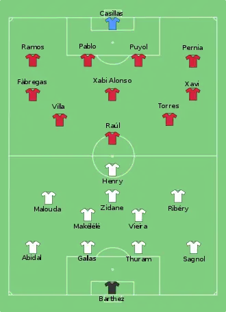Le début de match est plutôt à l'avantage des Espagnols, qui dominent, sans toutefois se procurer d'occasion franche, face à des Français certes moins possesseurs mais plus tranchants sur leurs quelques occasions de début de match. Les Espagnols parviennent cependant à ouvrir le score sur pénalty à la 28e minute, à la suite d'une faute commise par Lilian Thuram, le pénalty étant transformé par David Villa. Mais petit à petit, l'équipe de France impose son physique, notamment en milieu de terrain, et contrarie l'équipe d'Espagne. Juste avant la mi-temps, une passe en profondeur envoie Franck Ribéry défier Iker Casillas qu'il efface d'un dribble, lui permettant de marquer dans le but vide. La première mi-temps laisse ainsi le sentiment que le favori espagnol n'est peut-être pas en aussi bonne posture qu'imaginé.