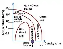 En analogie avec la thermodynamique des gaz réels, la matière nucléaire pourra exister sous différentes phases (voir infra). Mais à des énergies et/ou des pressions très élevées, on s'attend, sur la base de la liberté asymptotique de la chromodynamique quantique, à ce qu'elle devienne de la matière de quarks, qui est un gaz de Fermi dégénéré de quarks[4].