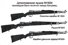 La famille des fusils M24 yougoslaves. De haut en bas : carabine M1924 Sokol, Fusil M1924,Mousqueton M1924ČK