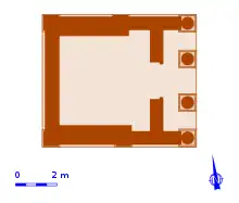 Le monument, élevé sur un léger podium, est bâti sur plan rectangulaire de 7,40 × 6,06 m. Il est orienté sur les quatre points cardinaux, son entrée étant tournée vers l'est[9]. Il s'agit d'un monument prostyle avec quatre colonnes lisses en façade ; deux sont adossées aux mur latéraux et deux autres occupent l'intervalle sur la largeur de la façade. Les murs de la cella sont décorés de pilastres cannelés, un à chaque angle de la façade arrière et un au milieu de chaque mur latéral[10]. Ces murs dont parementés de gros blocs de grès assemblés à joints vifs sans mortier ; les blocs sont solidarisés par des crampons en métal[11] et leur épaisseur diffère selon qu'il s'agit des murs latéraux (0,88 m) ou du mur du fond (0,62 m)[12].