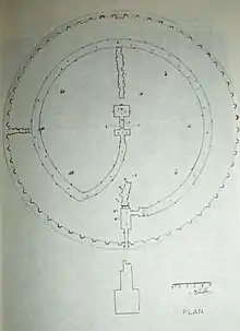 Au-dessus, la partie conique est constituée de 33 assises de pierre, hautes de 58 cm, et se termine par une plate-forme. Elle est largement échancrée au-dessus de la fausse porte de l'est[3].