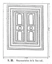 Une porte, à l'origine fermée par une dalle de pierre scellée qui a disparu, s'ouvre sur la face nord du mausolée. Au-dessus de cette porte, une plaque de marbre disparue figurait sans doute la dédicace du mausolée[17]. Chacun des trois autres murs est flanqué d'une fausse porte en marbre blanc[15], encadrée d'un chambranle à nervures, portant des croix gammées entourées d'un cercle[16].
