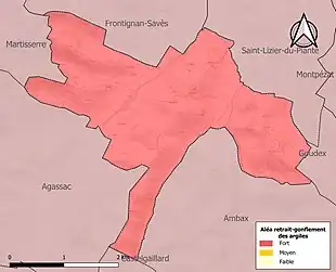 Le retrait-gonflement des sols argileux est susceptible d'engendrer des dommages importants aux bâtiments en cas d’alternance de périodes de sécheresse et de pluie. La totalité de la commune est en aléa moyen ou fort (88,8 % au niveau départemental et 48,5 % au niveau national). Sur les 42 bâtiments dénombrés sur la commune en 2019, 42 sont en aléa moyen ou fort, soit 100 %, à comparer aux 98 % au niveau départemental et 54 % au niveau national. Une cartographie de l'exposition du territoire national au retrait gonflement des sols argileux est disponible sur le site du BRGM[27],[Carte 3].