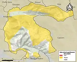 Le retrait-gonflement des sols argileux est susceptible d'engendrer des dommages importants aux bâtiments en cas d’alternance de périodes de sécheresse et de pluie. 66,5 % de la superficie communale est en aléa moyen ou fort (44,5 % au niveau départemental et 48,5 % au niveau national). Sur les 143 bâtiments dénombrés sur la commune en 2019, 108 sont en aléa moyen ou fort, soit 76 %, à comparer aux 75 % au niveau départemental et 54 % au niveau national. Une cartographie de l'exposition du territoire national au retrait gonflement des sols argileux est disponible sur le site du BRGM[32],[Carte 2].
