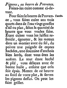 - Voir par exemple la recette donnée par François Massialot, Le Nouveau Cuisinier royal et bourgeois, Paris, (lire en ligne), p. 321.