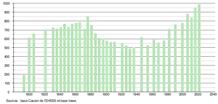 L'évolution du nombre d'habitants est connue à travers les recensements de la population effectués dans la commune depuis 1793. Pour les communes de moins de 10 000 habitants, une enquête de recensement portant sur toute la population est réalisée tous les cinq ans, les populations légales des années intermédiaires étant quant à elles estimées par interpolation ou extrapolation[17]. Pour la commune, le premier recensement exhaustif entrant dans le cadre du nouveau dispositif a été réalisé en 2006[18].