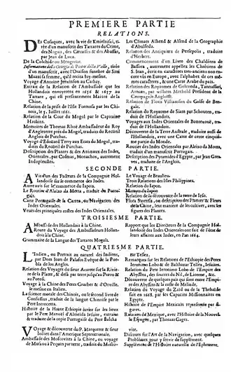Ce volumineux ouvrage (1 700 pages) est découpé en quatre parties, regroupées en deux volumes dans certaines rééditions. Il contient en particulier dans sa 3e partie la traduction française de la Description de la Chine[4] de Martin Martini, 216 pages remarquables, la première description exhaustive de la Chine par un Européen, après Marco Polo.