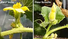 Les plantes sont monoïques (elles portent à la fois des fleurs mâles et des fleurs femelles) ou andromonoïques (elles portent des fleurs mâles et des fleurs hermaphrodites). La corolle jaune des fleurs est campanulée avec des pétales presque orbiculaires. L'inflorescence mâle est en fascicules de 2-4 fleurs et apparaît la première sur les 5e-12e nœud des rameaux primaires. Les fleurs femelles ou hermaphrodites sont solitaires, à corolle ovoïde et à ovaire infère. Elles apparaissent sur les rameaux tertiaires formés à partir du 14e nœud sur les rameaux primaires. Les fleurs ne s'ouvrent qu'une seule journée et sont à pollinisation principalement entomophile[8].