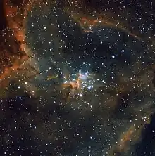 Astrophotographie de Melotte 15 (empilement de photos prises avec des filtres en bande étroite Hydrogène-alpha, Soufre et Oxygène)