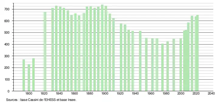 L'évolution du nombre d'habitants est connue à travers les recensements de la population effectués dans la commune depuis 1793. Pour les communes de moins de 10 000 habitants, une enquête de recensement portant sur toute la population est réalisée tous les cinq ans, les populations légales des années intermédiaires étant quant à elles estimées par interpolation ou extrapolation[34]. Pour la commune, le premier recensement exhaustif entrant dans le cadre du nouveau dispositif a été réalisé en 2004[35].