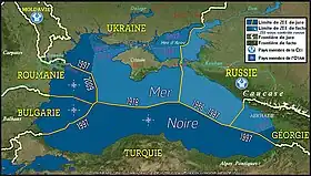 Plus récemment la mer Noire a été une zone de contact entre l'URSS et ses satellites au nord, et la Turquie membre de l'OTAN au sud : le rideau de fer la traversait donc. Aujourd'hui elle se trouve sur les marges les plus orientales de l'Union européenne, face à la CEI et à la Turquie. Les bases militaires de Crimée, stratégiques pour la Russie, sont depuis 2014 sous son administration directe. La péninsule et ses eaux territoriales appartiennent de jure à l'Ukraine, mais de facto à la Russie qui, à travers son contrôle et son occupation de l'est et du sud de l'Ukraine, jusqu'aux abords des bouches du Danube, contrôle de fait l'espace maritime ukrainien[27].