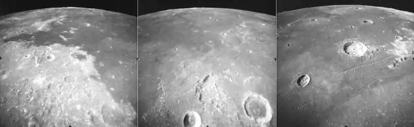 La photo centrale montre la jument centrale avec le cratère Vitruve (en bas à droite) et Gardner (en bas au centre). À l’horizon se trouvent des hautes terres plus claires à la marge sud de la jument, près du site d’atterrissage d’Apollo 11. Le cratère Jansen est visible sur les bords à la fois du centre et des photos de droite.