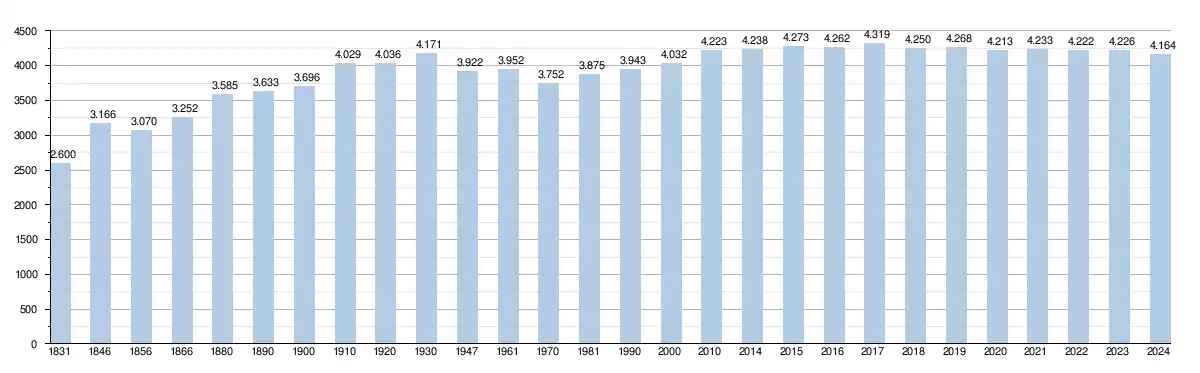 Elle comptait, au , 4 171 habitants (2 101 hommes et 2 070 femmes) [12], soit une densité de 136,62 habitants/km² pour une superficie de 30,53 km²[13].