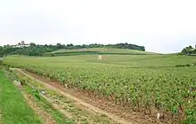 Vue des Clos des Montaigus (premier cru) et du château de Montaigu.