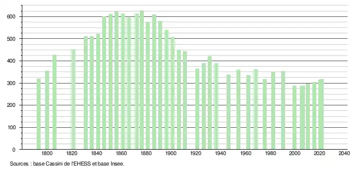 L'évolution du nombre d'habitants est connue à travers les recensements de la population effectués dans la commune depuis 1793. Pour les communes de moins de 10 000 habitants, une enquête de recensement portant sur toute la population est réalisée tous les cinq ans, les populations légales des années intermédiaires étant quant à elles estimées par interpolation ou extrapolation[20]. Pour la commune, le premier recensement exhaustif entrant dans le cadre du nouveau dispositif a été réalisé en 2005[21].