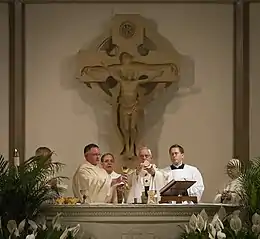 Après les rites initiaux et la Liturgie de la Parole vient la troisième partie de la messe, la Liturgie eucharistique, dans laquelle on répète les quatre actions du Christ à la Cène : il prit le pain, il rendit grâce, il le rompit, et le donna a ses disciples. À ces quatre actions correspondent la préparation des dons, la Prière eucharistique, la fraction du pain et la communion.