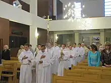 Le prêtre se rend à l'autel en procession, précédé des clercs et servants de messe : accompagné du naviculaire, le thuriféraire qui balance son encensoir fumant ouvre la procession, si l´on emploie l´encens[13]; sinon c'est le cruciféraire portant la croix de procession et les céroféraires l'encadrant et portant des cierges allumés qui précèdent la procession ; puis suivent les acolytes (porte-missel, porte-micro lorsque le prêtre qui préside la messe ne se tient pas à l'autel), un lecteur ou un diacre élevant l'évangéliaire ; les diacres puis les prêtres clôturent la procession, sauf lorsque la cérémonie est présidée par l'évêque[14]. Dans ce cas, la procession des diacres, deux par deux et des prêtres concélébrants deux par deux, est clôturée par l'évêque coiffé de la mitre et portant la crosse, suivi un peu en arrière des porte-insignes (porte-mitre (de) à droite, porte-crosse (de) à gauche, équipés des vimpas) et du cérémoniaire qui l'assiste[15].
