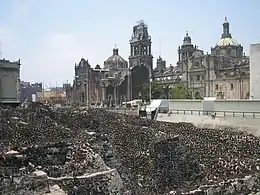 Au nord de la place centrale, qui coïncidait à peu près avec l'actuel Zócalo de Mexico[s 12], une quarantaine de bâtiments publics formaient le centre religieux (Templo Mayor)[s 13]. Il comptait une pyramide avec deux sanctuaires, d'autres temples (de Quetzalcoatl, de Tezcatlipoca, de Ciuacoatl, de Coacalco)[3], mais aussi un collège (calmecac), le Mecatlan (école de musique) et des arsenaux[12].