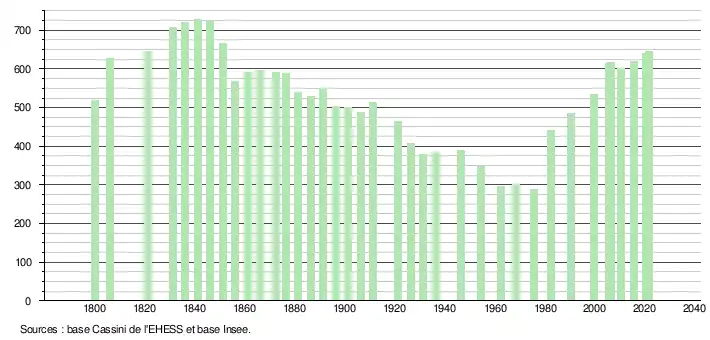 L'évolution du nombre d'habitants est connue à travers les recensements de la population effectués dans la commune depuis 1800. Pour les communes de moins de 10 000 habitants, une enquête de recensement portant sur toute la population est réalisée tous les cinq ans, les populations légales des années intermédiaires étant quant à elles estimées par interpolation ou extrapolation[19]. Pour la commune, le premier recensement exhaustif entrant dans le cadre du nouveau dispositif a été réalisé en 2005[20].