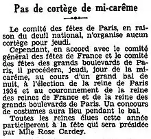 - C'était hier la Mi-Carême, Le Petit Journal, 9 mars 1934, page B, 4e et 5e colonnes.