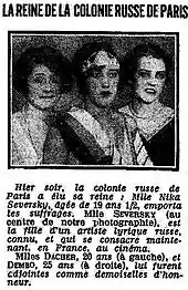 - L'élection de la reine de Paris, Le Petit Parisien, 4 mars 1932, page 3, 3e colonne.