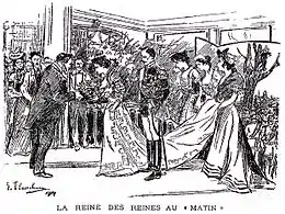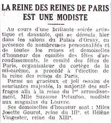 - La reine des reines de Paris pour 1934 a été élue hier, Le Matin, 5 mars 1934, page 5, 4e colonne. Voir l'article reproduit dans Commons.