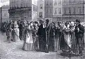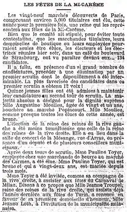 - « Tous nos lecteurs savent qu'il est d'usage, à Paris, d'élire à l'occasion de la fête de la Mi-Carême, une reine dans chaque lavoir ; on choisit de même une reine du (marché du) Temple et une reine des Halles.