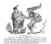 - L'invention de la Mi-Carême est bien plus récente que celle du carnaval. On avait de très bonne heure senti le besoin d'inaugurer par des plaisirs bruyants une longue période d'abstinence ; quand la foi se fut encore affaiblie, on jugea à propos de couper par une halte cette longue période de privations : on créa la Mi-Carême. Telle est sa raison d'être évidente ; quant à la cause occasionnelle de son existence, elle est moins sûrement connue. On attribue la Mi-Carême à la coutume établie dans quelques petites villes, parmi les jeunes gens, de donner, le mardi-gras un dernier bal aux jeunes filles du pays ; celles-ci donnaient à leur tour une fête le troisième jeudi de carême.