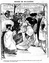 Au moins dès le XVIIIe siècle la Mi-Carême parisienne se présente à nous comme une immense fête féminine et populaire, dont les premières héroïnes sont les blanchisseuses. À Paris « Mi-Carême » et « fête des blanchisseuses » à un moment-donné deviennent synonymes. Et le restent bien après que les blanchisseuses ont cessé d'être les héroïnes officielles de la Mi-Carême[27]. Le défilé des reines sur les grands boulevards, puis le cortège de la Reine des Reines à partir de 1891 jusqu'aux années 1930, sont les seuls qui ont pu acquérir dans le cadre du Carnaval de Paris une stature considérable, au même titre que la Promenade du Bœuf Gras et la descente de la Courtille.