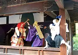 Une série de trois à six pièces différentes est jouée pendant une journée de représentations. La durée d’une pièce est généralement comprise entre 45 minutes et une heure. Chaque pièce commence par une série de coups de gong (Hōraku wari) afin de chasser les démons. Après la dernière représentation de la journée, l’ensemble de la troupe monte sur scène, accompagné d’un prêtre bouddhiste qui anime une cérémonie religieuse d’une dizaine de minutes.