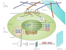 La destruction de la MEC impacte également les cascades de signalisation cellulaire qui sont contrôlées par l'interaction entre des récepteurs transmembranaires et des constituants de la MEC. Par exemple, cette destruction expose des sites de liaison précédemment cachés. C'est le cas pour l'intégrine alpha-v beta-3 (αVβ3) que l'on trouve à la surface de cellules de mélanome et qui peut être ligaturé après la dégradation du collagène de la MEC, ce qui constitue un signal anti-apoptotique de survie cellulaire pour les cellules de mélanome[33],[34]. En outre, les produits de dégradation peuvent augmenter la tumorigénicité des cellules cancéreuses et ils pourraient être utilisables comme biomarqueurs[33]. La MEC est une sorte d'"éponge" à facteurs de croissance. Ainsi, sa destruction libère des cytokines et des facteurs de croissance qui y sont stockés (par exemple le VEGF, le facteur de croissance basique des fibroblastes (bFGF), le facteurs de croissance analogues à l'insuline (IGF1 et IGF2), le TGF-β, l'EGF, le facteur de croissance de type EGF se liant à l'héparine (HB-EGF) ou encore et le facteur de nécrose tumorale (TNF)). Ces molécules de signalisation peuvent augmenter la croissance de la tumeur[31],[35].