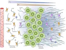 Le stroma entourant une tumeur réagit souvent à une intrusion par la mise en place d'une inflammation, de la même manière qu'un stroma de tissu sain pourrait réagir à une plaie[22]. Cette inflammation peut favoriser l'angiogenèse, accélérer le cycle cellulaire et empêcher la mort cellulaire, ce qui augmente la croissance tumorale[23].