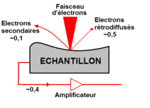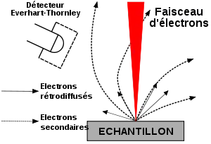 La figure ci-contre illustre le schéma de principe d’un MEB : une sonde électronique fine (faisceau d’électrons) est projetée sur l’échantillon à analyser. L’interaction entre la sonde électronique et l’échantillon génère des électrons secondaires, de basse énergie qui sont accélérés vers un détecteur d’électrons secondaires qui amplifie le signal. À chaque point d’impact correspond un signal électrique. L’intensité de ce signal électrique dépend à la fois de la nature de l’échantillon au point d’impact qui détermine le rendement en électrons secondaires et de la topographie de l’échantillon au point considéré. Il est ainsi possible, en balayant le faisceau sur l’échantillon, d’obtenir une cartographie de la zone balayée.