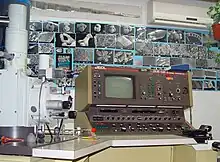 Par la suite, c’est le scientifique allemand Manfred von Ardenne qui, en 1938, a construit le premier microscope électronique à balayage[8]. Mais cet appareil ne ressemblait pas encore aux MEB modernes car il avait été créé pour étudier des échantillons très fins en transmission. Il s’apparente donc plus à un microscope électronique en transmission à balayage (METB ou (en) STEM pour scanning transmission electron microscope). De plus, bien que doté d’un écran à tube cathodique, les images étaient enregistrées sur des films photographiques disposés sur un tambour rotatif. Von Ardenne a ajouté des bobines de balayage à un microscope électronique en transmission. Le faisceau d’électrons, d’un diamètre de 0,01 µm, balayait la surface de l’échantillon et les électrons transmis étaient récupérés sur le film photographique qui était déplacé au même rythme que le faisceau. La première micrographie obtenue par un MEBT fut l’image d’un cristal de ZnO grossi 8 000 fois avec une résolution latérale de 50 à 100 nanomètres. L’image était composée de 400 par 400 lignes et il a fallu 20 minutes pour l’obtenir. Le microscope disposait de deux lentilles électrostatiques entourant les bobines de balayage.