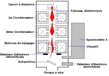 Un microscope électronique à balayage est essentiellement composé d’un canon à électrons et d’une colonne électronique, dont la fonction est de produire une sonde électronique fine sur l’échantillon, d’une platine porte-objet permettant de déplacer l’échantillon dans les trois directions et de détecteurs permettant de capter et d’analyser les rayonnements émis par l’échantillon. En outre l’appareil doit nécessairement être équipé d’un système de pompes à vide[4].
