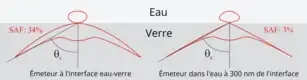 - En microsocpie avec des échantillons biologiques, les particules fluorescentes sont généralement situées dans un milieu aqueux (indice de réfraction ) sur une lame de verre de microscope (indice de réfraction ). L'angle critique de l'interface eau/verre est alors de 61°.