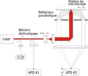 Pour éclairer les échantillons, la lumière d'un laser est réfléchie dans la lentille asphérique par un miroir dichroïque. La lentille asphérique concentre le faisceau laser dans l'échantillon, provoquant la fluorescence des particules.