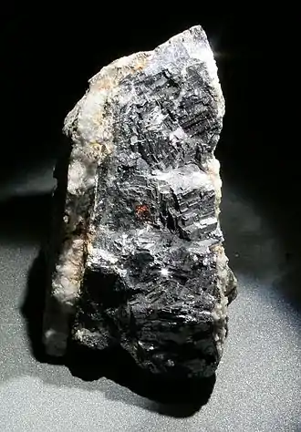 Les principaux minerais exploités étaient de deux types[N 31], le plus souvent mêlés : d'une part la cérusite (PbCO3), ou minerai oxydé, aux reflets rouges ou jaunes du fait de l'oxyde de fer qu'elle contient, d'autre part la galène, ou minerai sulfureux (PbS), caractérisée par ses grains noirs. Leur teneur en plomb est élevée (77,5 % pour la cérusite, 86,6 % pour la galène), mais fort variable si l'on prend en compte la gangue qui entoure le minerai, allant de pourcentages de l'ordre de l'unité jusqu'à 50 %, pour une moyenne de 15 %. L'argent se situait à l'intérieur de ces molécules de carbonate de plomb ou de sulfure de plomb, dans des proportions allant de 500 à 4 000 g par tonne de minerai extrait, avec une moyenne de 2 kg : ainsi, une tonne de minerai à 20 % de plomb contenait environ 400 g d'argent (0,04 %)[98]. Du fait de ce caractère relativement pauvre pour des métallurgistes modernes, le minerai du Laurion nécessitait un long processus de traitement et de transformation pour en extraire l'argent convoité.