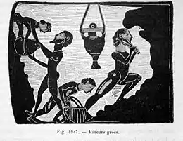 Les mineurs étaient presque exclusivement de condition servile. Nombre d'entre eux étaient des barbares : en consultant les listes de travailleurs enregistrées au IVe siècle av. J.-C., on trouve un tiers de Thraces[77]. Comme cela est souvent le cas pour des individus affectés à des tâches subalternes, les noms de très peu d'entre eux sont parvenus jusqu'à nous : tout juste a-t-on pu identifier une inscription (IG, II2, 10051) d'un mineur d'origine paphlagonienne et amateur d'Homère, Atôtas, qui compare « son effort à celui des héros (il se proclame même descendant de Pylaïménès, tué par Achille)[78] ».