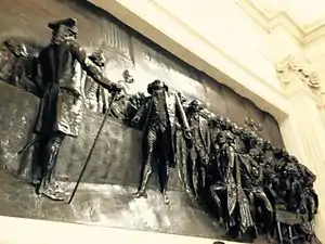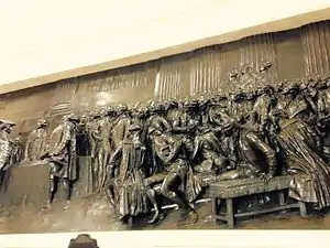 Le haut-relief représente une scène de la séance royale du 23 juin 1789 durant les États généraux de 1789, dans une salle de l'hôtel des Menus-Plaisirs de Versailles. Alors que le roi demande aux délégués de se séparer, il n'est suivi que par la noblesse et une partie du clergé. La demande du roi est réitérée à Jean Sylvain Bailly par le grand maître des cérémonies, Henri-Évrard de Dreux-Brézé, qui lui rétorque : « La Nation assemblée ne peut recevoir d'ordre ». Puis Mirabeau se serait avancé pour dire : « Allez dire à ceux qui vous envoient que nous sommes ici par la volonté du peuple, et qu'on ne nous en arrachera que par la puissance des baïonnettes. »