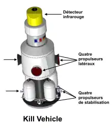 Aucun système de destruction par radar déterminant la distance et ordonnant la mise à feu d'un explosif qui projette des débris qui vont détruire la cible ne peut calculer la destruction à provoquer dans ces laps de temps incroyablement court[15]. Seule solution : aller à la rencontre - et donc au choc de l'arme par l'intercepteur - en faisant se croiser les trajectoires. Si elles pouvaient être parfaitement déterminées, un intercepteur fait d'une masse d'acier lancée par un missile balistique sur une trajectoire ad hoc conviendrait. Or cette trajectoire (qu'il va falloir déterminer, voir ci-dessous) sera toujours imparfaite. Il faut que l'objet intercepteur puisse réaliser les petites et dernières corrections de trajectoire qui s'imposeront pour aller au choc. D'où son appellation de « Kill Vehicle » (KV) ou « véhicule tueur » qui apporte sa contribution avec son détecteur infrarouge et ses moteurs[16] (figure b ci-contre) juste avant le choc.
