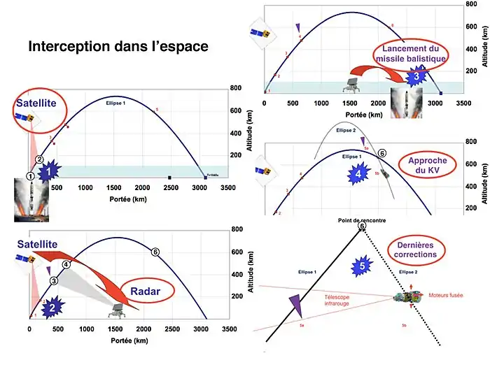 - Le KV est lancé quelques minutes après sur la trajectoire calculée (ellipse2, en pointillé) pour que le choc se produise en 6. Mais la trajectoire calculée par le radar ne peut être parfaite. Doté d'une capacité de détection infrarouge, le KV dès qu'il est « en vue » de l'arme assaillante (image 4) recalcule de façon fine la trajectoire de collision et corrige les erreurs en se déplaçant un peu selon quatre axes à l'aide de ses quatre moteurs fusées tout en poursuivant sa trajectoire (image 4 agrandie en 5) ce qui conduit à la collision prévue en 6.