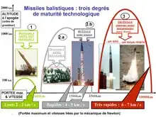 - Ce qui les caractérise toutes, c'est bien d'arriver sur leur cible dans l'atmosphère à une vitesse de l'ordre ou un peu supérieure celle des avions de combat les plus rapides. (armes des Scud, des No-Dong et des premiers missiles balistiques à deux étages…) ;