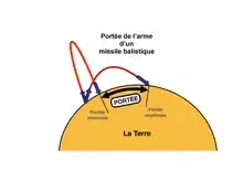 - Les armes des missiles balistiques de première génération qui, soit ne s'en séparent pas (Scud…) soit s'en séparent (génération qui suit), mais ne leur donnent pas une vitesse très grande. Elles peuvent accroître leur portée en utilisant l'atmosphère par un rebond (qui modifie la trajectoire[3]), ce que faisait le français Hadès et fait le SS26 Iskander russe.