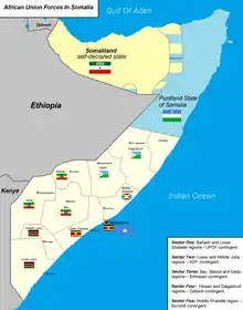 Début 2016, l'Amisom compte 22 000 hommes, dont 6 000 d'Ouganda, 5 400 du Burundi, 4 400 d'Éthiopie et 3 600 du Kenya[8].