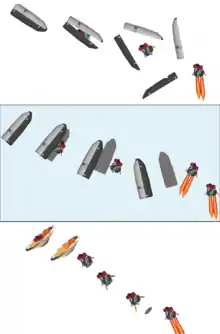 - utilisation de la propulsion nucléaire thermique pour les phases d'accélération/décélération entre la Terre et Mars qui permet de bénéficier d'une impulsion spécifique pratiquement doublée (910 secondes au lieu de 455 avec un moteur dérivé de la technologie du NERVA). La masse du réacteur nucléaire et les panneaux de protection contre les radiations qui en émanent constituent cependant un handicap ;